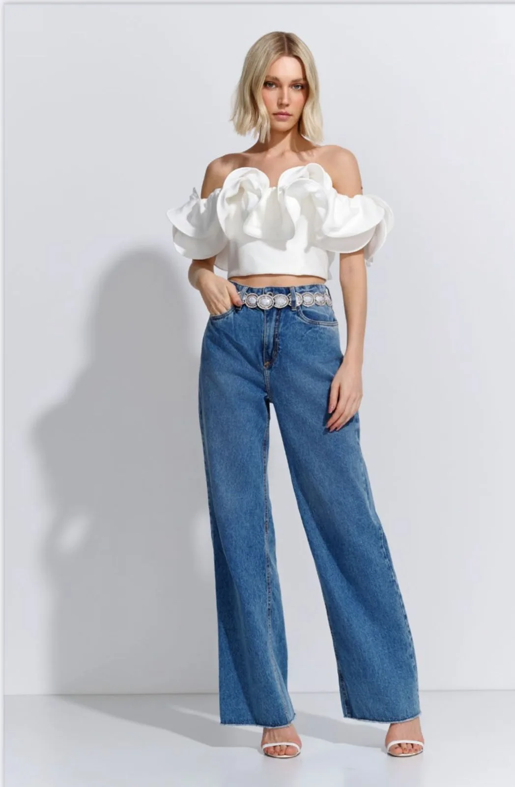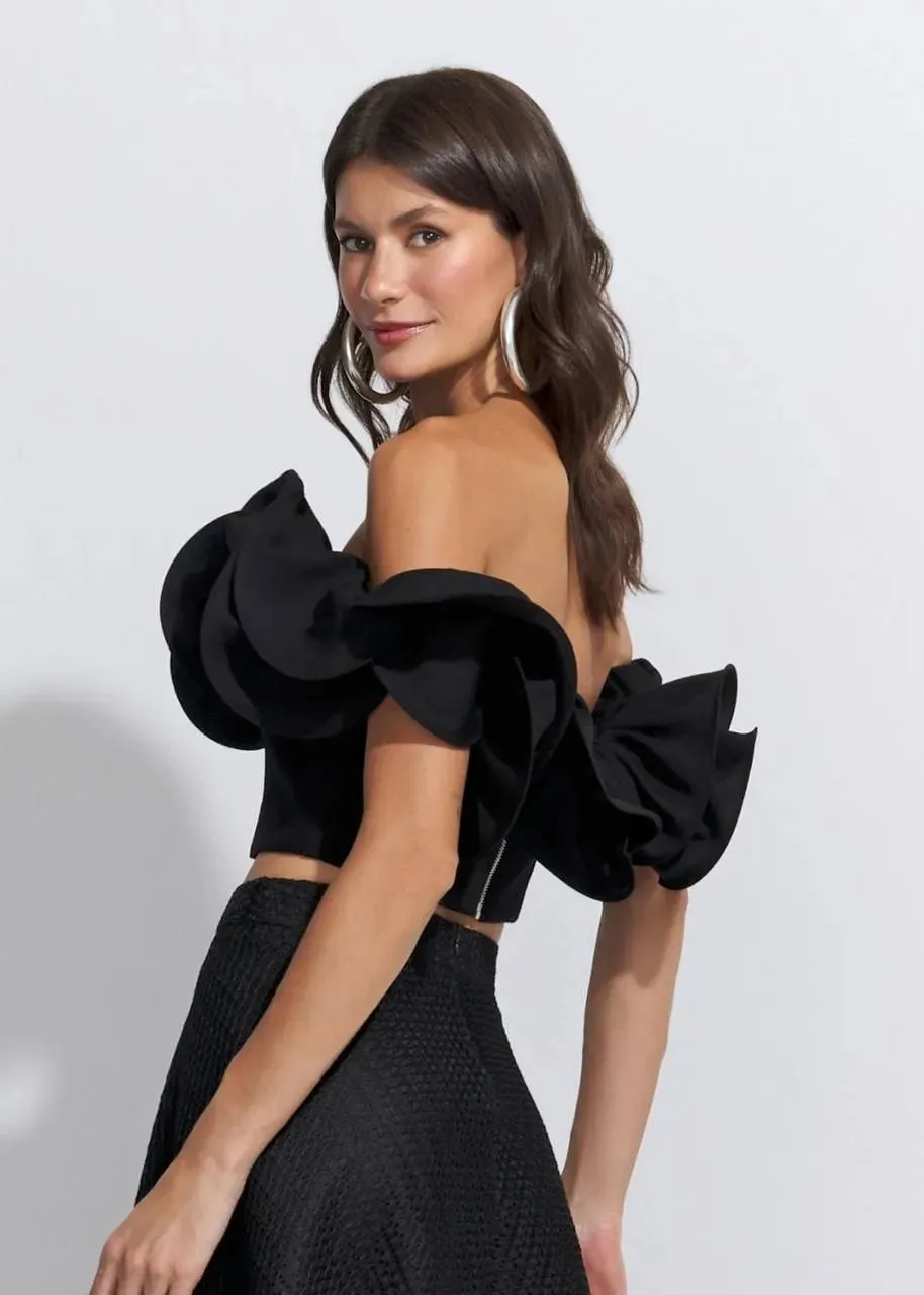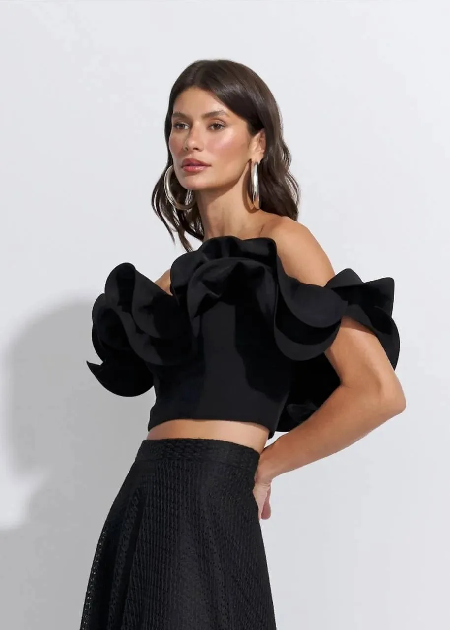 Escolha a Blusa Ombro a Ombro Ruffle Visco Twill e sinta a fusão perfeita entre modernidade, conforto e elegância. Uma peça que transcende tendências e se torna essencial em qualquer guarda-roupa.